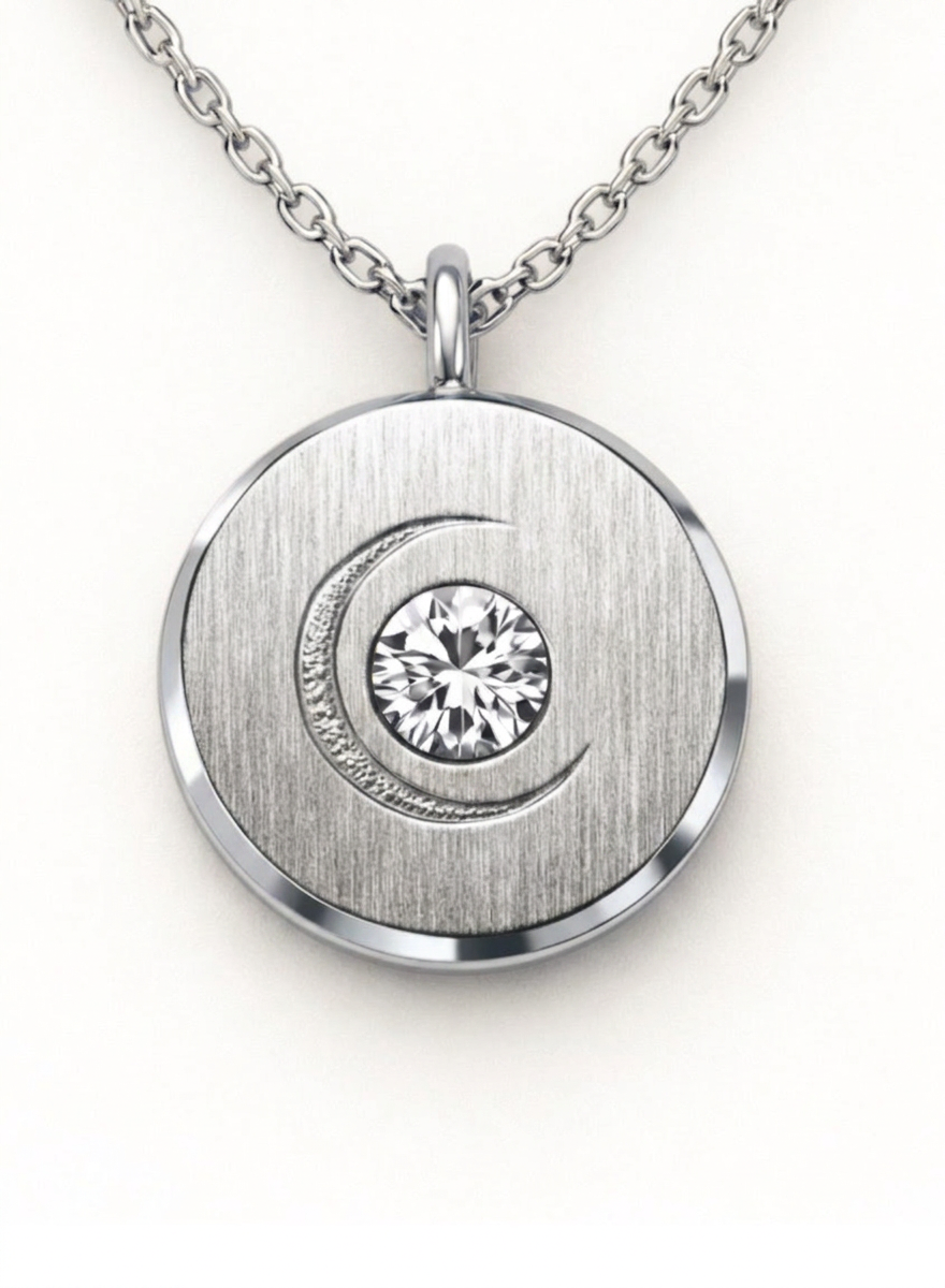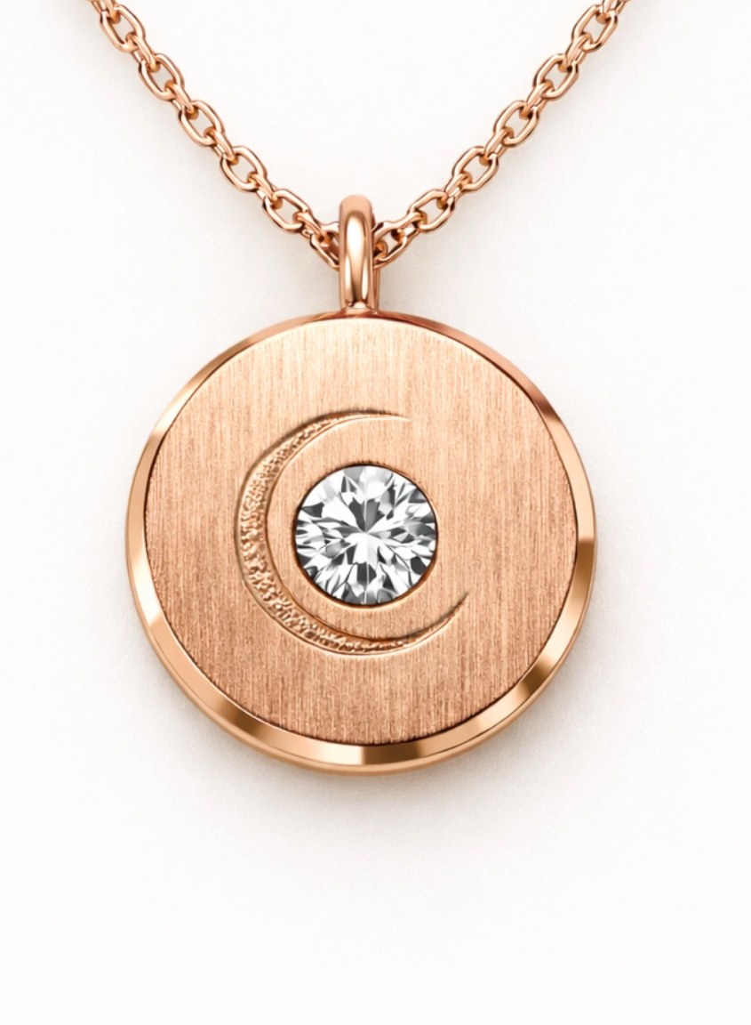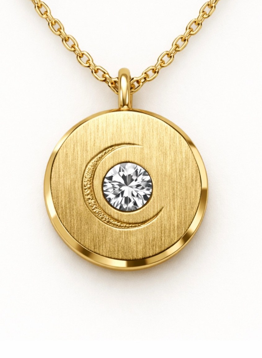 A delicate medallion that rests close to the heart — engraved with a crescent moon, centered with a diamond, a quiet symbol of inner light.